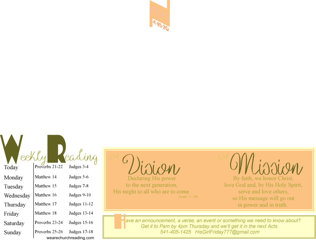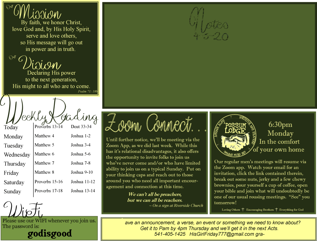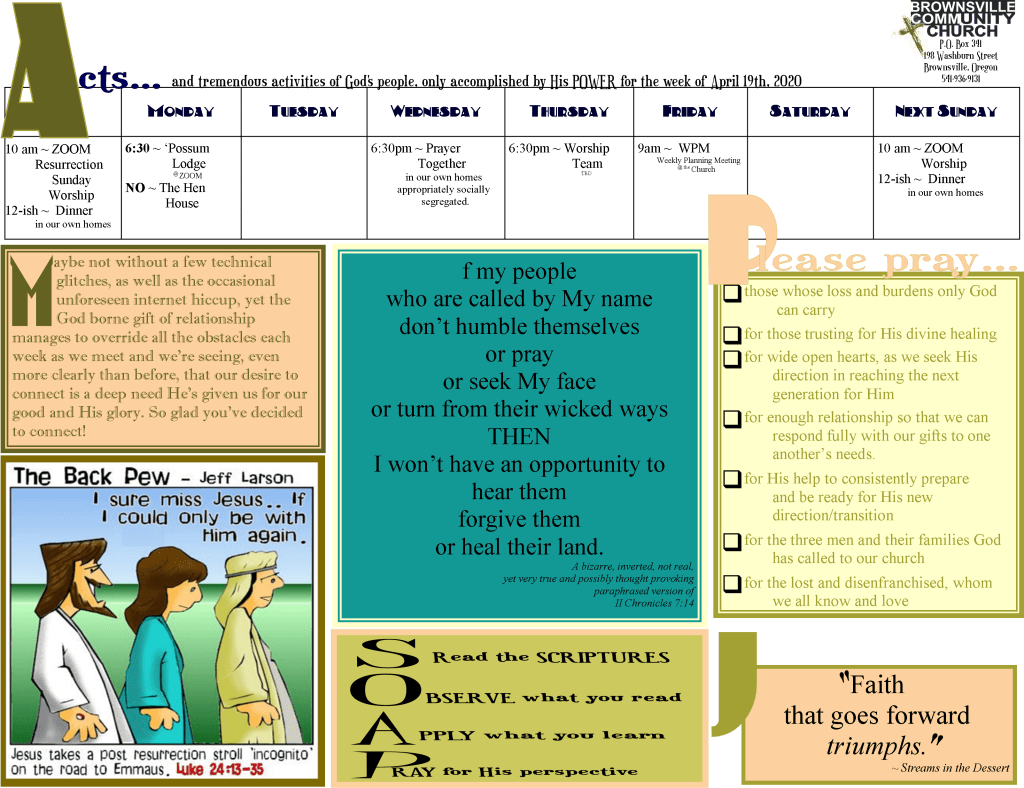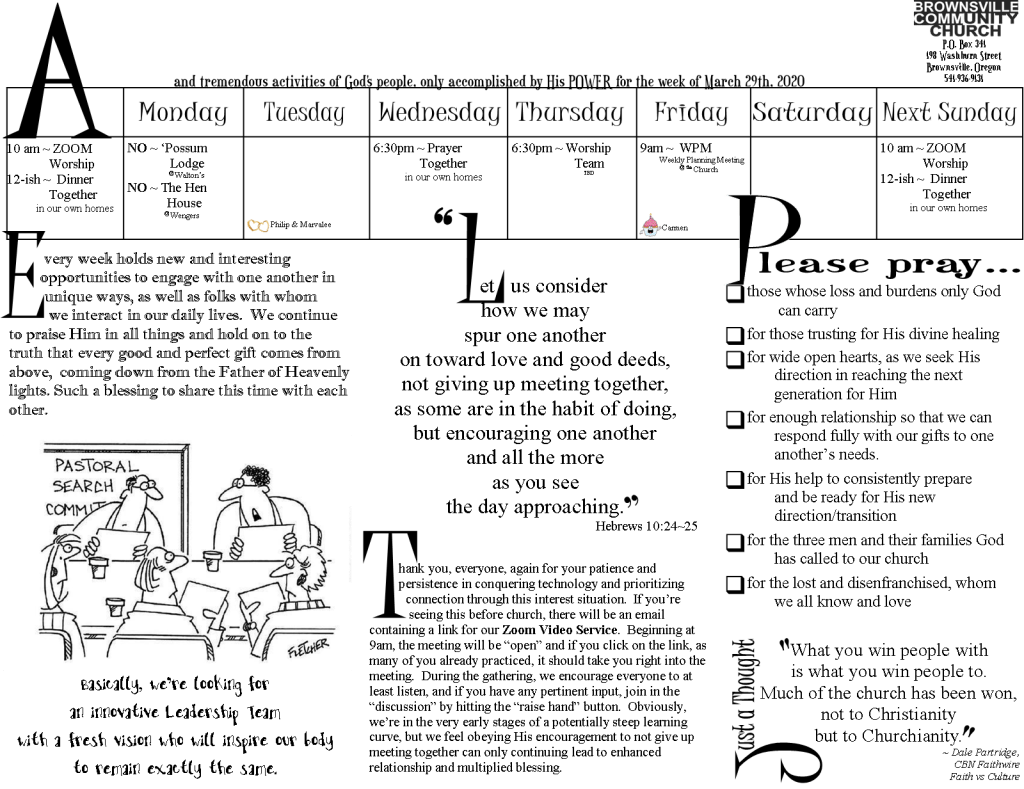 Our solution? Zoom App meetings. Pretty high tech for some of us who are on the more technologically challenged end of things, but we’re doing it. So, if you can join us during this time, please shoot your email to us at brownsvillecommunitychurch@gmail.com, let us know you’re interested in being a part of our Sunday morning meeting and we’ll send you an email invitation on Sunday morning.